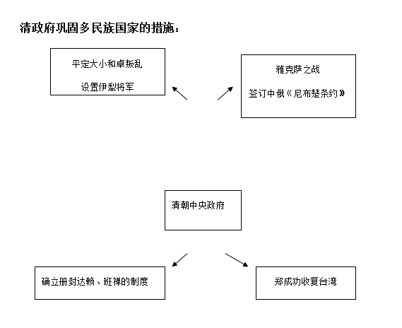 郑成功于1662年从荷兰殖民者手中收复台湾,清朝于1684年,清设置台湾府,巩固海防和国家统一。③清朝康熙帝时取得两次雅克卫反击战的胜利,遏制了沙俄在我国黑龙江流域的侵略,1689年,沙俄与清朝签订《尼布楚条约》。是中俄第一个边界条约,在法律上肯定了包括库页岛在内的广大地区都是中国的领土。