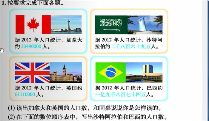 1、结合具体情境,借助数位顺序表,掌握大数的读、写方法,能正确地读、写大数,同时培养认真读、写数的良好习惯。