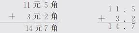设计意图:学生先根据问题直接列式,然后引导学生借助已有知识经验进行计算,在交流讨论中得出小数加减法的计算方法。在这一过程中,充分发挥了学生的主体作用,在知识加工的过程中逐步吸纳了新知识,改变了原有的认知结构。