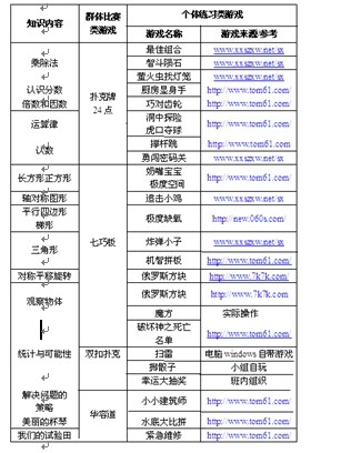 在综合考虑上述几种分类的基础上,我们试对小学数学游戏与具体内容的教学进行了匹配。以下是三四年级的数学游戏资源库目录: